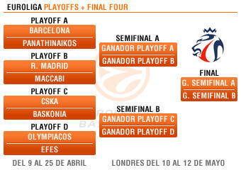 Dos míticos de la competición se encuentran en Cuartos de Final , cruce en el cual el Real Madrid intentará acabar con el dominio del Maccabi en los últimos años( en la temporada 2010/2011, el Maccabi venció con autoridad en el primer partido de esa Final Four al conjunto blanco) y llegar a la Final Four de Londres .